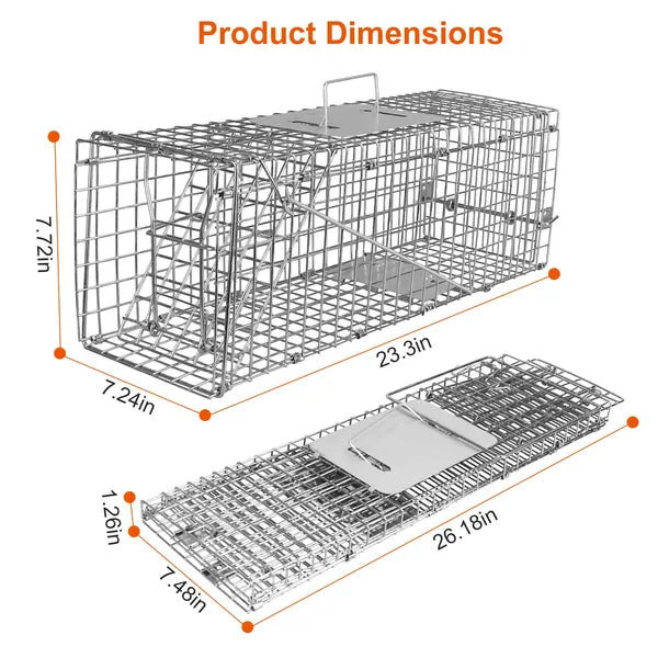 Trampa humana: La jaula incluye un pedal sensible y puerta frontal con resorte; el animal solo necesita tocar suavemente el pedal para que la trampa se active y la puerta se cierre automáticamente. También incluye puerta trasera para liberar al animal.
